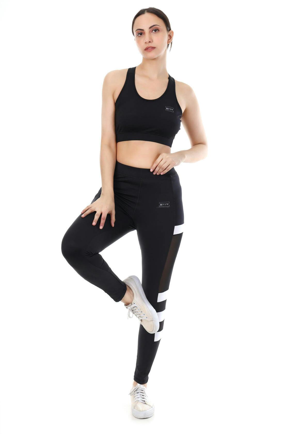 Redefine your sporty style with the StripeEdge Co-ord Set, a bold mix of performance and fashion. Featuring a black sports bra and matching leggings with striking white stripe accents and mesh paneling, this set is designed to keep you moving in comfort while turning heads with its edgy look.